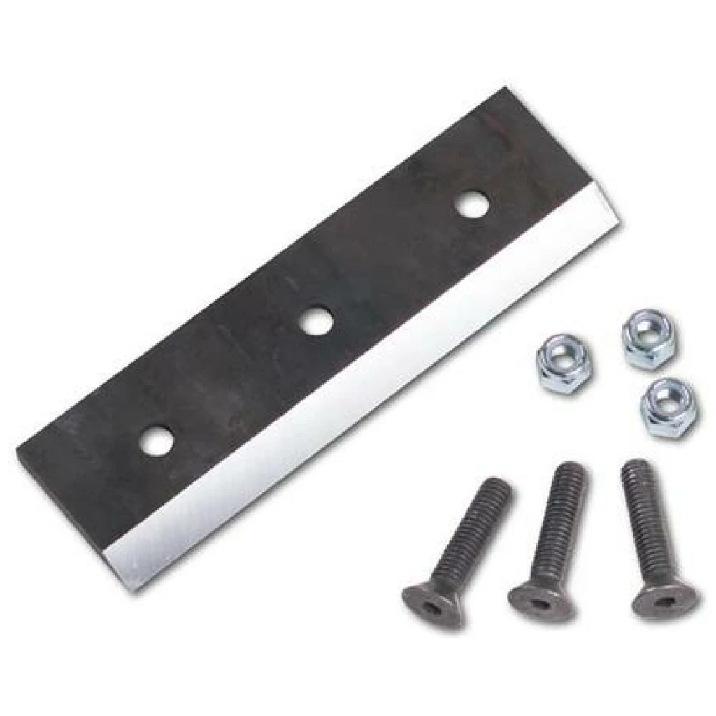 Because our knives are made of high-carbon/high-chromium forged alloy tool steel, they can go significantly longer than the knives on most “bargain” chippers without sharpening. Still, as with any cutting tool, keeping a sharp edge is important for maintaining peak performance. When the chipper starts to “bog” down, and/or vibrates and requires that you regularly force the material downward into the chipper chute, it’s usually a sign that the knife is dulling. Many customers choose to get an extra knife to have on hand. That way, you can keep working with a minimum of downtime. The replacement DR Chipper Knife Kit comes with all the necessary hardware. Hardened steel knife Hardware Please refer to your owner’s manual for sharpening and installation instructions. Please call us toll-free 1-800-687-6575 if you have questions about your DR. TIP: If chipping a lot of soft wood (pine, spruce etc.), and pitch build up is observed on the knife, it is recommended to occasionally chip some hard wood to clean the pitch off the knife.