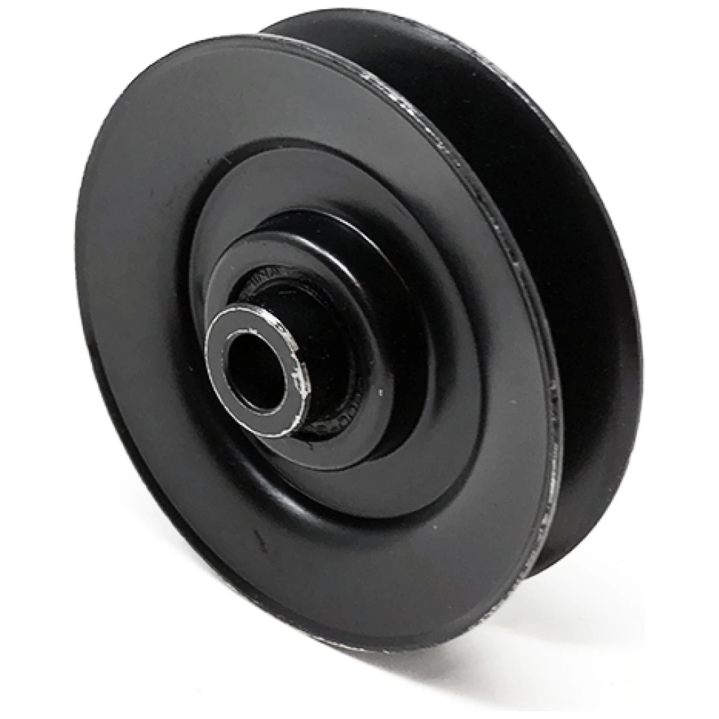 This item is available as an individual replacement part. The idler pulley fits between the spacer and the idler arm spacer. During replacement, it may require a wrench to help install this part correctly. It is made of metal and will require replacing if it breaks. This genuine item is supplied by the original equipment manufacturer for use with Toro riding mowers and lawnmowers.